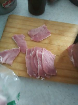 猪肉切适当的条状或块状,建议切小一点 比较入味 不过正宗东北锅包肉都是大块的哦^_^加盐,适当酱油,我因个人喜好加了一些生粉让肉更嫩。 拌匀