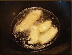 锅中油烧至五六成热,把火调到中火,将肉片裹上稠糊,一片片下到锅中,炸熟定型;