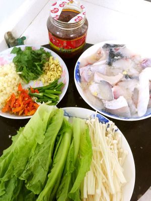 1、配料,配菜准备就绪,根据分量适当添加即可; ps:鱼片选择草鱼,用蛋清和生粉稍加抹匀