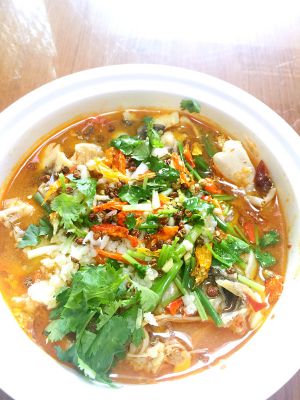 4、放香菜葱花,花椒,辣椒在汤碗内,然后烧热油淋在上面,大功告成啦,香喷喷的美味极了,相信你也可以