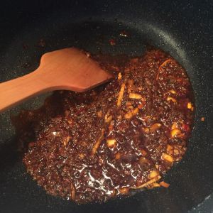 烧热油后关小火加入姜丝蒜末煸出香味,然后加入酱料继续小火煸出红油