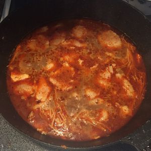 然后加水大火烧开后加入配菜,等再次煮开以后再住个五分钟左右就能关火取出配菜。