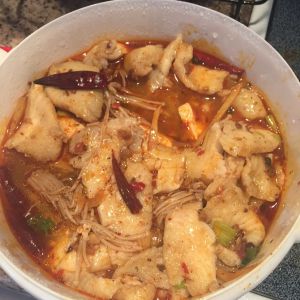等所有材料煮沸后,将水煮鱼鱼料用油爆香淋到煮好的鲶鱼上即可