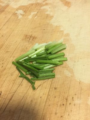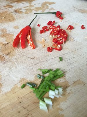 小米椒切圈,香菜梗切段,然后洒在排骨上用于点缀。
