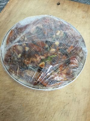 把调好的汁倒入排骨里,再加入一勺食用油和少许淀粉之后用手将排骨抓匀,让排骨和调好的的汁充分结合混匀之后将排骨放入盘中摆放好,并裹上保鲜膜放入冰箱腌制一个晚上。