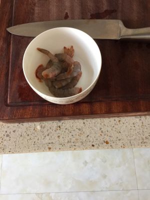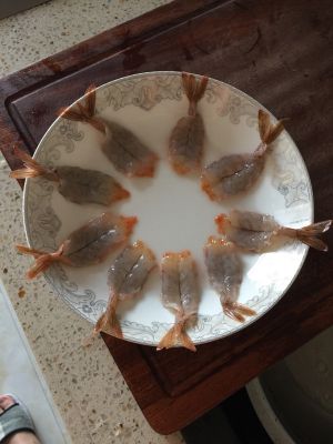 新鲜大虾洗净,去头去壳,留尾部一节壳,从中间用刀尖切开,不要切断,挑出虾线,这是一个漫长而艰难的细活,为了孩子能吃顿好的也是拼了