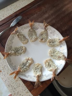 无头虾处理干净后做成凤尾虾形状,锅里放少量油后放细细的面包屑翻炒至金黄色