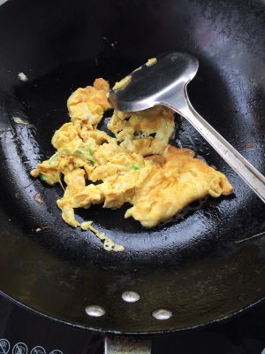 锅放少许油,等热后,放鸡蛋入锅,摊匀,翻炒几下,出锅。