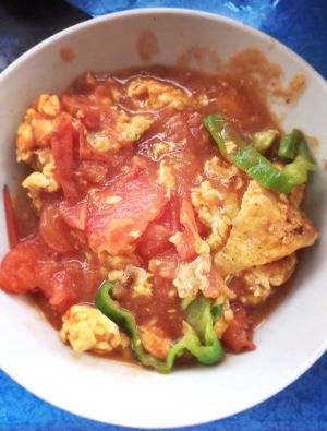 番茄和青辣椒切片入锅,切勿火大,待出汁后,鸡蛋倒入翻炒少加盐,出锅