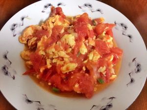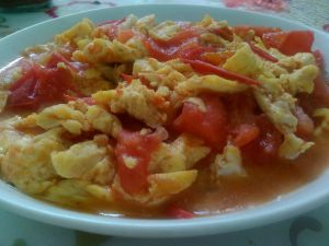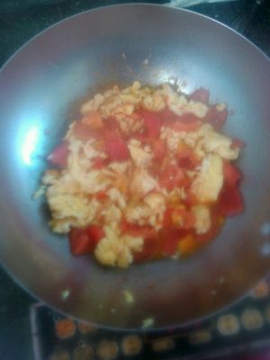 把鸡蛋倒进锅里,和西红柿拌一下,就可以吃了!!