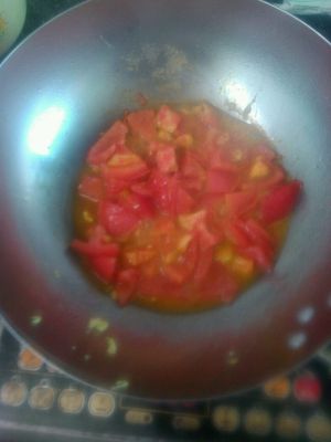锅内再加少许油,烧热后下番茄,大火翻炒并不时用锅铲背用力压番茄使它出汁,加入少许盐和糖,炒至番茄变软烂,汤汁变浓稠