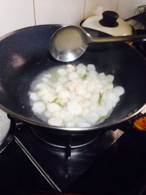 将浆制好的虾仁放入沸水中断生(15秒左右);