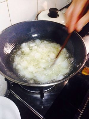 锅里倒油(油比平时炒菜的用量多一倍),油温3-4成时,下腌制好的虾仁滑炒。