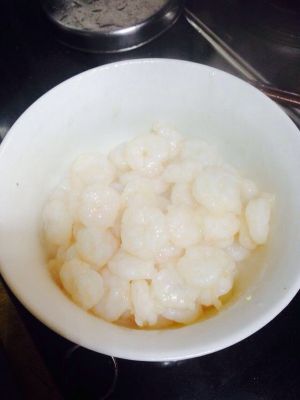 虾仁加盐、黄酒、淀粉上浆腌制,加蛋清颜色会更好看,这次做的没有加蛋清,上浆过程影响虾仁的口感,用手不停一个方向搅拌摔打虾仁,确保所有虾仁都挂上浆。