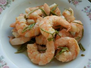 倒入虾仁保持大火,加入一点泡好的茶叶翻炒收汁即可。