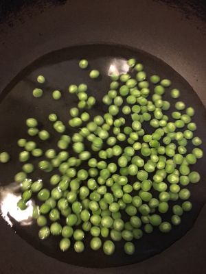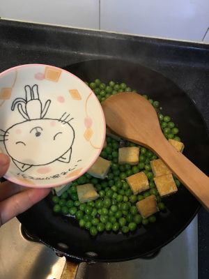 油热后煎臭豆腐,煎至金黄色,倒入焯好水的青豆,加少许水,轻轻的翻炒。