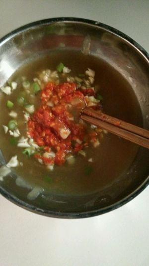 接下来另起锅 加入水 水开后 放入一半小葱 放入沾料料包 烧30秒左右放淀粉水 为的是让汤汁更浓 烧开出锅 放入辣酱 剩余的葱和大蒜沫