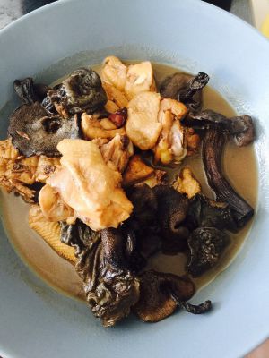 泡榛蘑的水与开水混合倒入锅中没过鸡肉,大火烧开转中火炖15分钟。