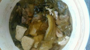 酸菜切丝冲水入盐味,排骨剁块炖煮熟备用,鸭血切片