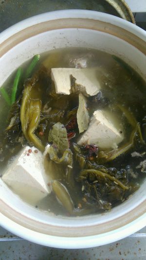 蒜子呛锅加猪油煸炒酸菜加高汤,放入排骨烩制即可