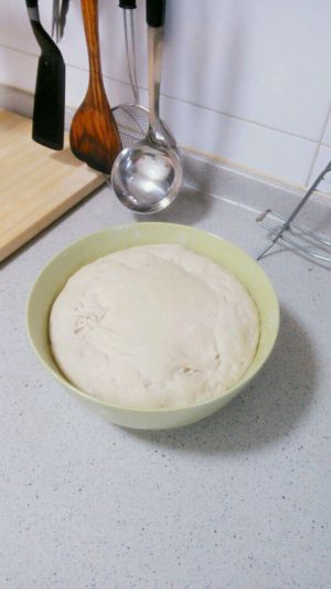 放在室内暖和的地方,用麻布盖上(麻布要用水浸透拧到不滴水),等待发酵,直到发现现在的面团是最初面团2倍,即可使用。我的图片是发酵好的。嘻嘻~