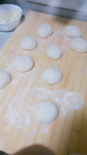 把面团从盆子里拿出来,揪成这样的小团,每个都用手揉光滑即可。