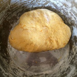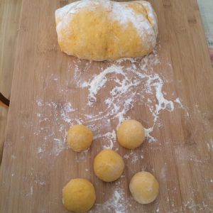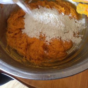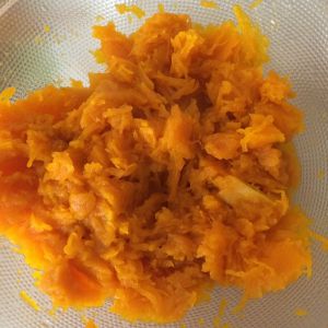 南瓜蒸熟,捏成泥,加入干酵母和泡打粉,