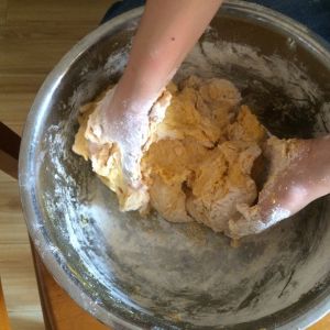 把南瓜倒入面粉中搅拌,如果太干中途可以加一些温水在揉,揉至盆光面光手光做到三光,即可