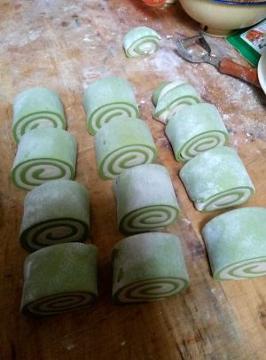 然后把两团面擀平,叠在一起,卷成长条,捏好形状。