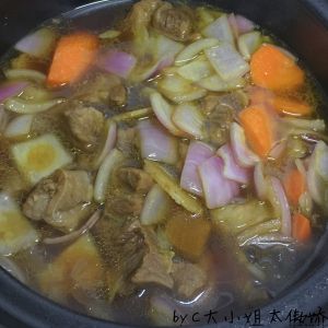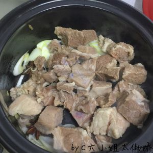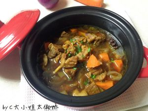 忘记拍翻炒的细节图了~ 热锅倒油,先将牛腩爆炒,再加入配料翻炒,再加入土豆、胡萝卜,翻炒过后加入热水瞒过肉,大火烧开改用砂锅用小火炖上一小时,再大火收汁即可出锅。