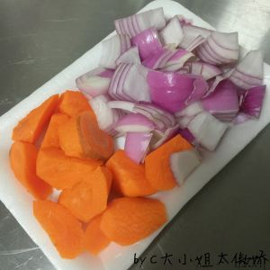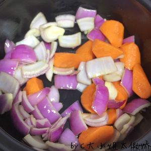 起油锅 将洋葱和胡萝卜炒制8分熟后盛出备用