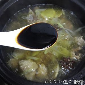 加入足量的高汤或开水,放入八角香叶,大火炖10分钟,转中小火继续炖50分钟至汤汁变得浓稠。出锅前5分钟烹入生抽,根据自己的口味再调入适量盐即可。