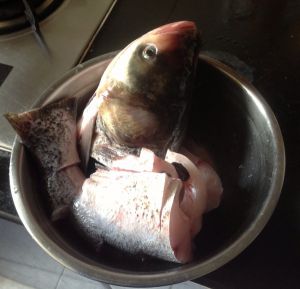 胖头鱼去鳞洗净后,将头与鱼身分开。