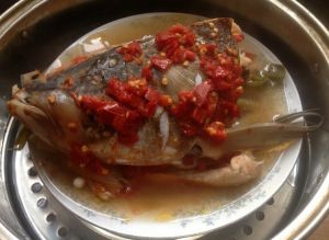 把剁椒盖在鱼头上,然后开始蒸,慢点20分钟左右也就好了。
