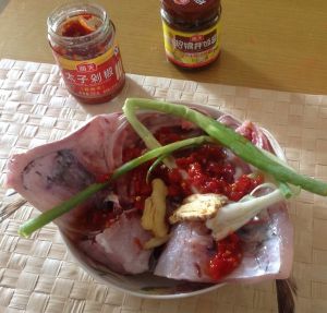 将鱼头从中间剖开,抹上由料酒,生抽,白胡椒粉,剁椒酱,鱼露,蚝油调成的酱料,再加姜片与葱结一起腌制。