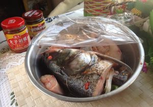 把鱼头从中间剁开,洗干净,用盐酱酒腌制20分钟。