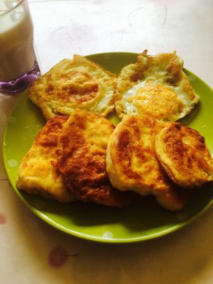 馒头切片、然后放入搅拌好的鸡蛋液滚一下