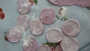 紫薯蒸熟后捣成泥,待温热时加入面粉和发酵粉,揉至不粘手,待面团发大后开始擀成薄片,再用模具取圆形!