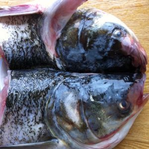 将鱼头洗净,用盐将鱼头内外抹一道。