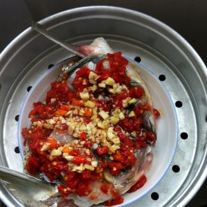 炒好的剁椒均匀码在鱼头上,再淋4 勺蒸鱼豉油、盐不到一勺,锅内水烧开,鱼头放里面,大火蒸20分钟。