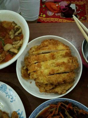 腌好的鸡片,沾面包渣,使劲压着沾,然后放入鸡蛋液里,再沾面包渣,