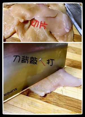 把鸡胸脯肉切成薄片,然后用刀背轻轻敲打(为了更加酥嫩)。