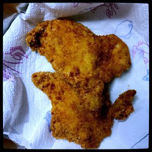把香喷喷的炸鸡排取出,热乎乎,特别香。放入砧板,切块,太好了。