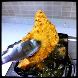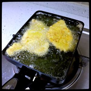 锅里放入食用油,油热4-5层热时,把裹好面粉、鸡蛋、面包糠的鸡胸脯肉放进油锅里炸