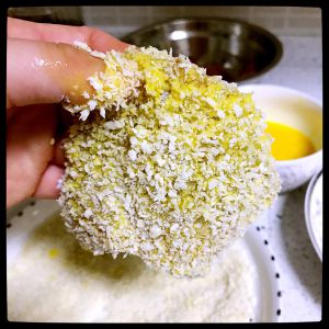 从冰箱取出,均匀裹一层蛋液,再裹一层面包糠。为什么要用蛋液?涂抹一层鸡蛋液,可以把面包糠粘住,炸出的鸡排更酥脆。