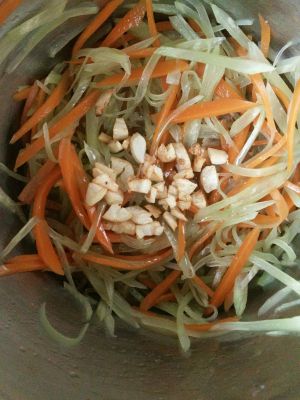 胡萝卜丝和莴笋丝一起放入适量盐、醋、鸡精、香油拌匀,也可以按照个人口味凉拌,莴笋丝我也稍微焯了一下,嫌麻烦的这一步也可以省略