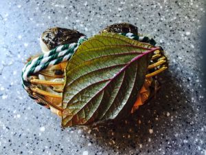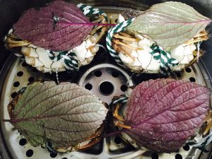 将螃蟹盖朝下放置,取一片紫苏叶盖在蟹腹上;