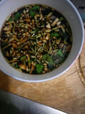 蒸蟹的过程中,可以制作醋汁,把姜蒜香菜放入小碗中,加入陈醋,生抽,耗油。