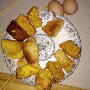 锅中放油,烧热,馒头片裹上蛋液,放入锅中煎成金黄色。图片里是最后拍的,把所有的都到锅里了!馒头也没切好,