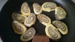 热锅,放入适量油,油热后调成中小火,放入馒头片,一面蛋液凝结后翻面,直到两面都呈金黄即可。